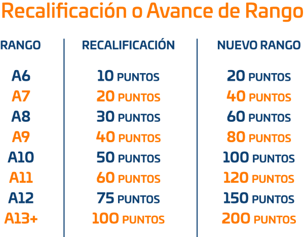 3. Recalificación o Avance de Rango Personal a partir del rango A6 (200 puntos posibles).